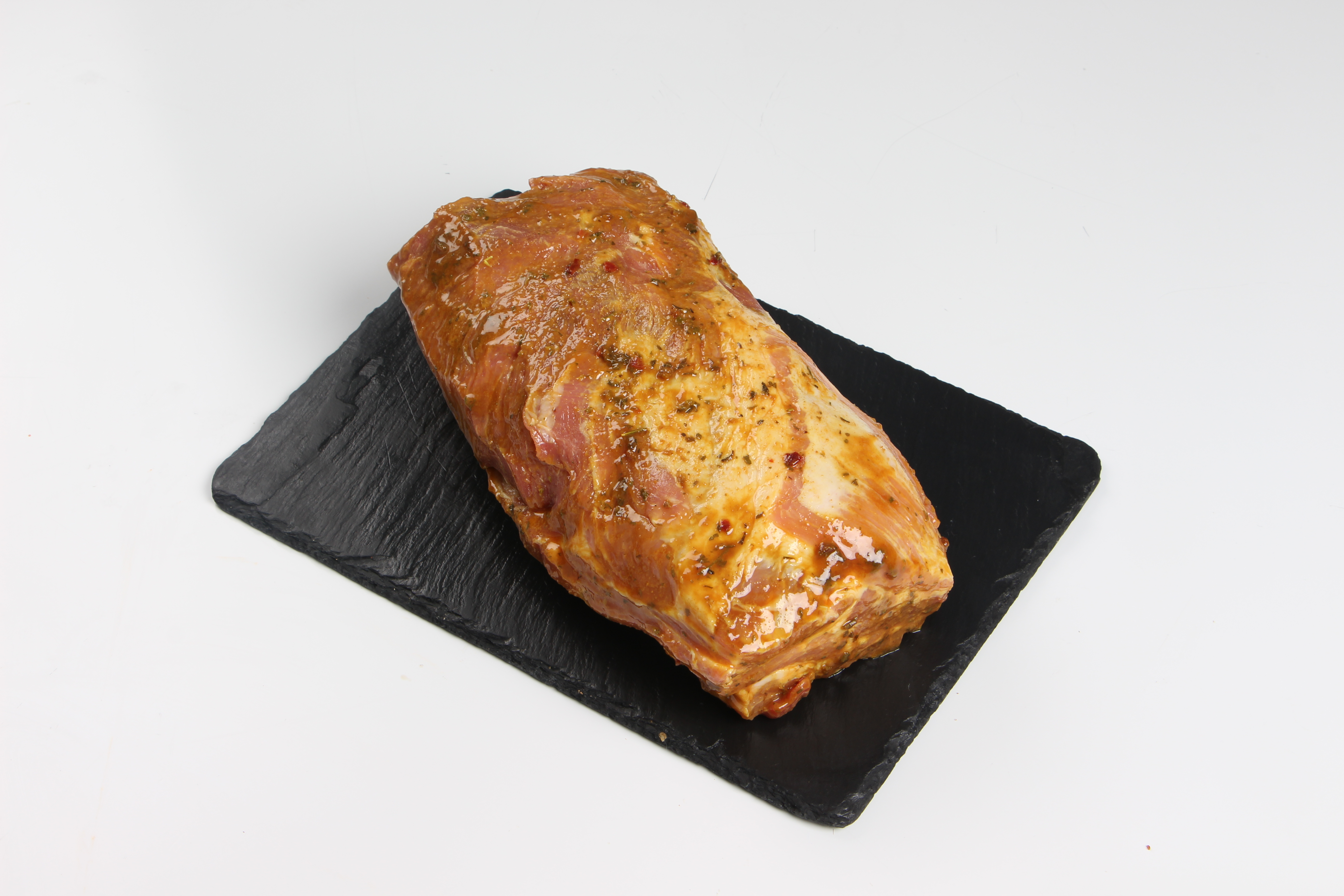 Svinenakke tilsat marinade: (Vegetabilsk olie (raps, delvis hærdet), SENNEP 28% (vand, SENNEP, eddike, salt, sukker), salt, krydderier (gurkemeje, bønneurt, persille, oregano, SELLERI), gærekstrakt, sukker, peberfrugt, karamelsukker, konserveringsmiddel (E262), krydderiekstrakter (SENNEP, rosmarin, paprika)).
