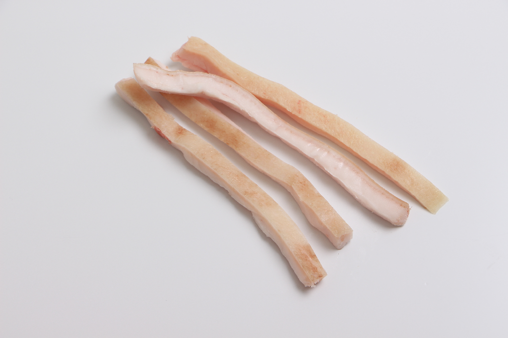 Rygsvær skåret i strimler på ca. 10 mm., klar til at lave lækre flæskesvær.