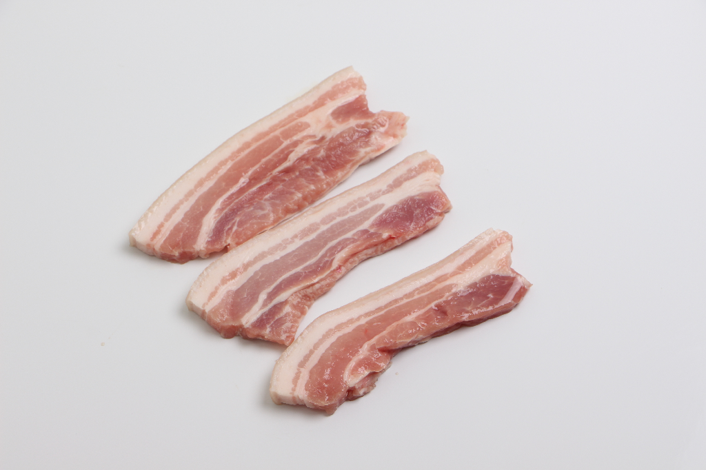 Brystflæsk uden ben, skåret i 25 mm tykke skiver, og sprængt i saltlage.