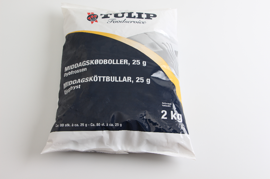 Grisekød (40%), oksekød (20%), vand, ÆGGEHVIDER, løg, HVEDEMEL, kartoffelmel, rasp (HVEDEMEL, salt, gær), salt, oksefedt, hvid peber.