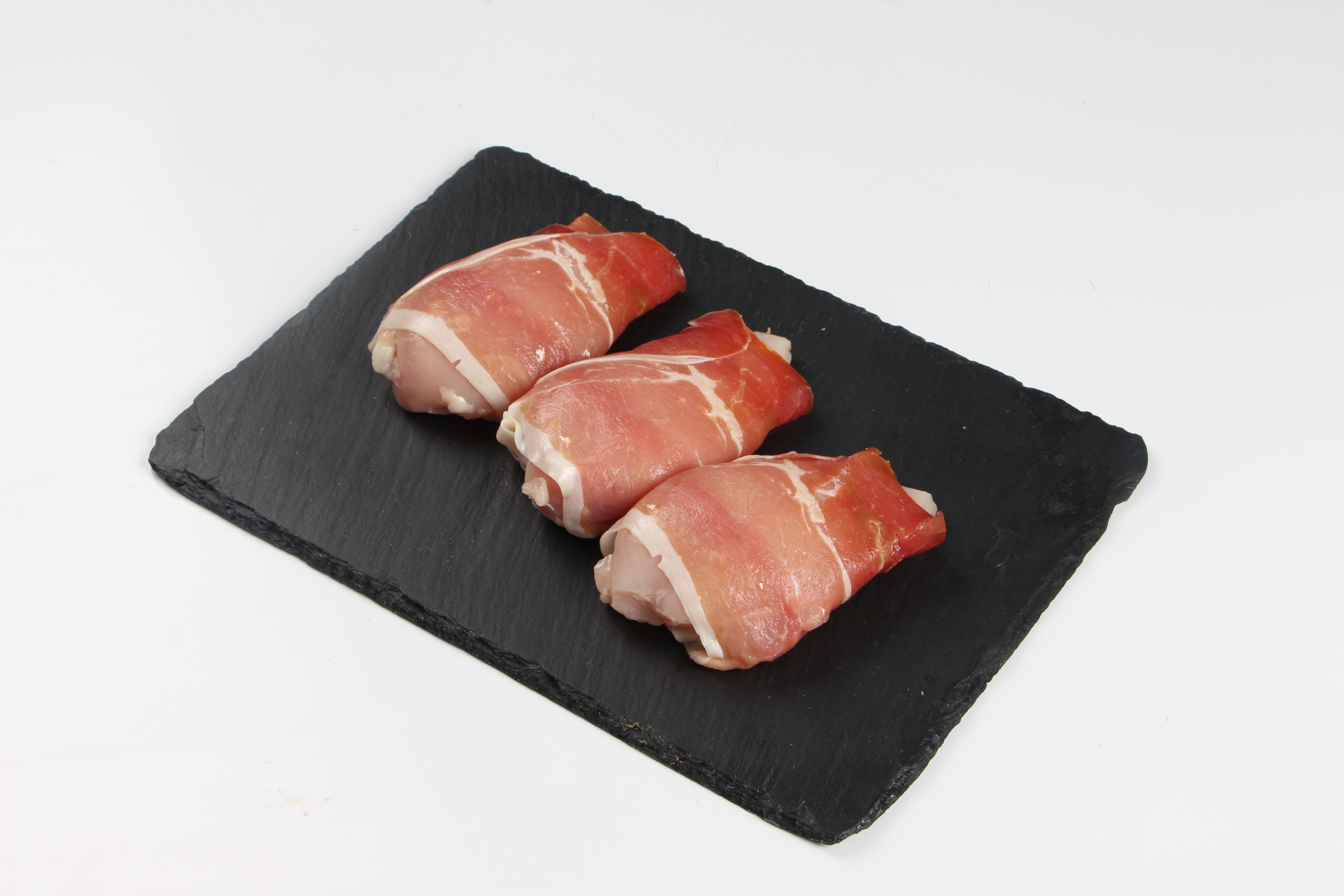 Kyllingebryst 115-130 gram, viklet med spansk Serrano-skinke. Egen produktion. Bestil styk eller kilo.