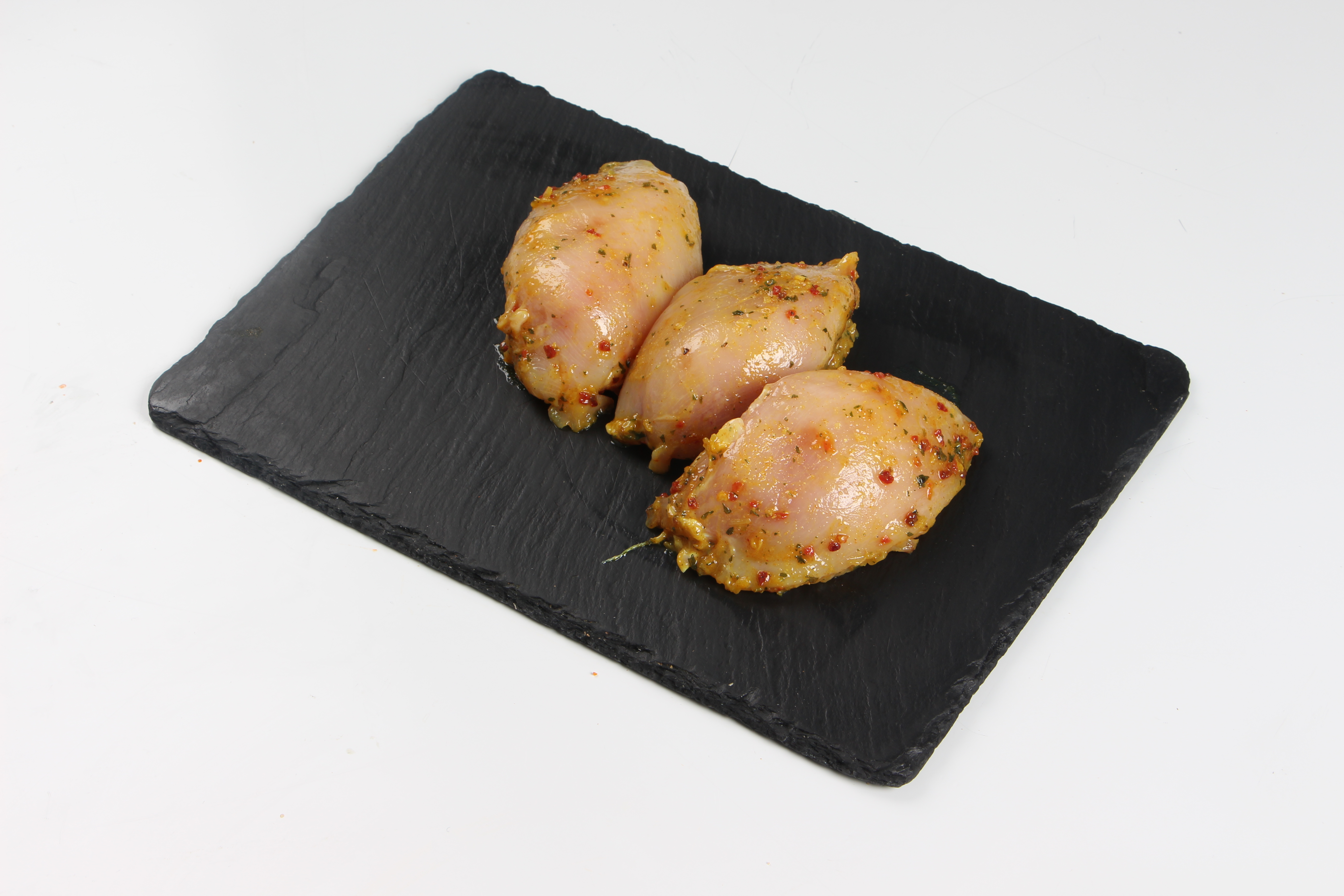 Kyllingebryst tilsat marinade:(Vegetabilsk olie (raps, delvis hærdet), salt, peberfrugt, SENNEP, løg, sukker, surhedsregulerende middel (E262), karry 4%(gurkemeje, koriander, spidskommen, chili, muskatnød, bukkehornsfrø), aroma (karry, tomat), urter (persille, oregano), tomat, pastinak, krydderiekstrakt (gurkemeje)).).