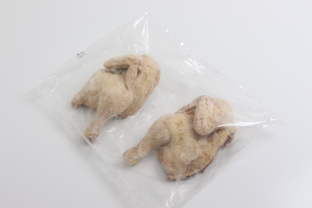 1/2 kylling med ben 92%, vand, HVEDEmel, salt, stabilisatorer: E451 og E450. Kan indeholde spor af: ÆG, SOJA, MÆLK, SELLERI, SENNEP.