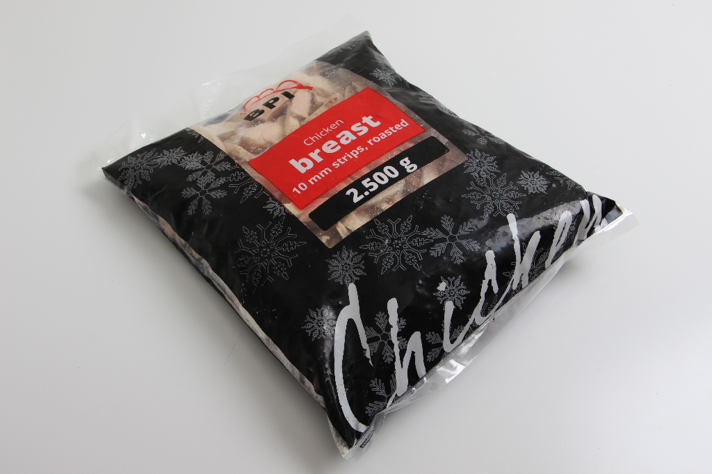 Stegt kyllingebryst skåret I 10 mm brede strimler, fra Euro Poultry.