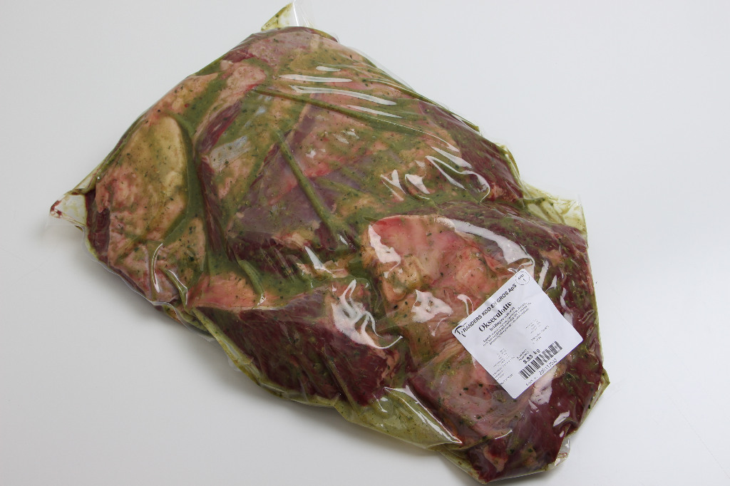 Oksecuvette tilsat marinade: (Vegetabilsk olie (raps, delvis hærdet), krydderier (hvidløg 10%, rosmarin 1%, persille, ingefær, purløg), salt, sukker, spinat).