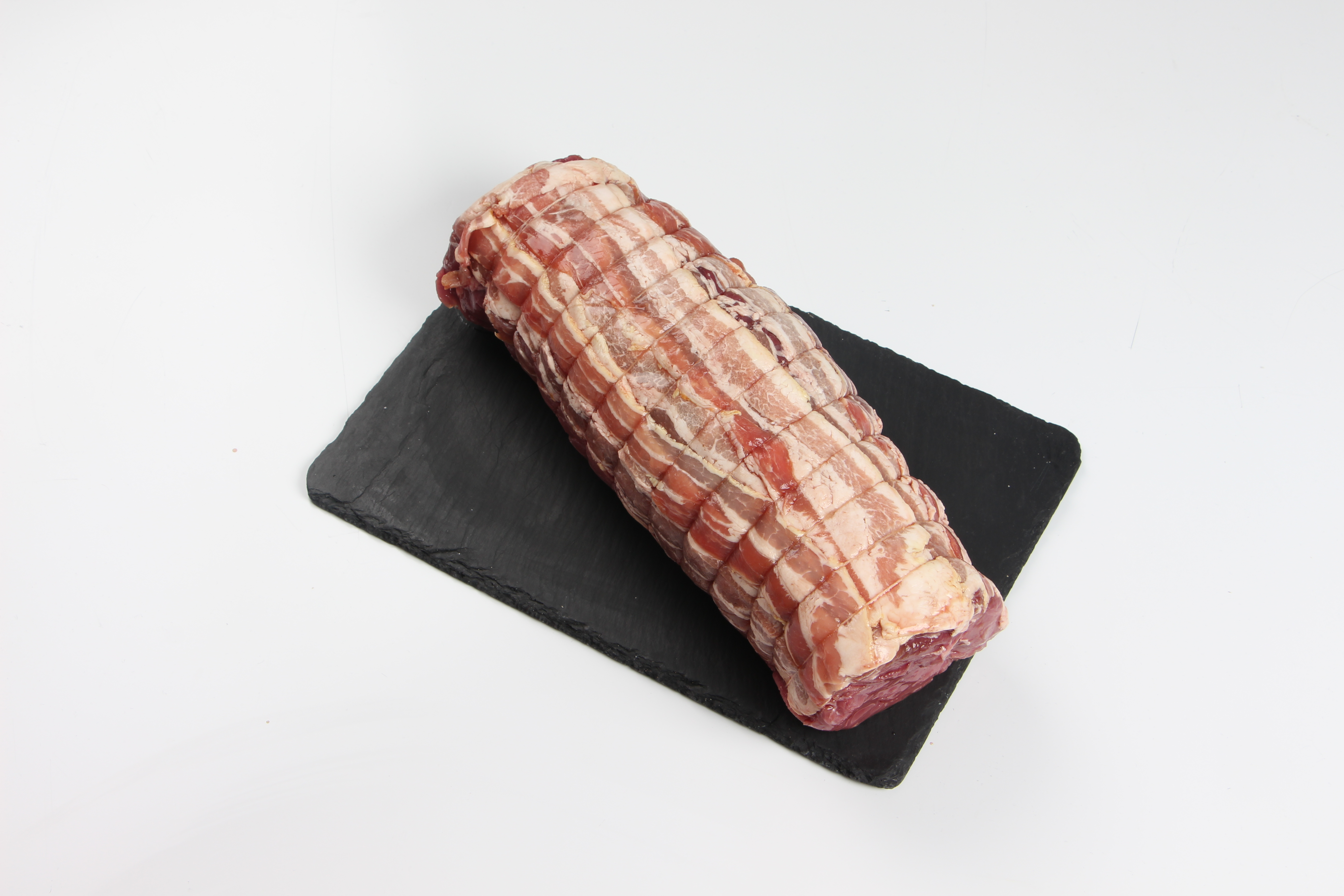 Oksetykkam svøbt i tynde baconskiver, og snørret.