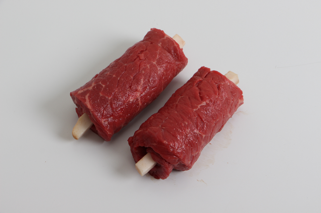 Okseinderlår i skiver, viklet om en strimmel spæk.
