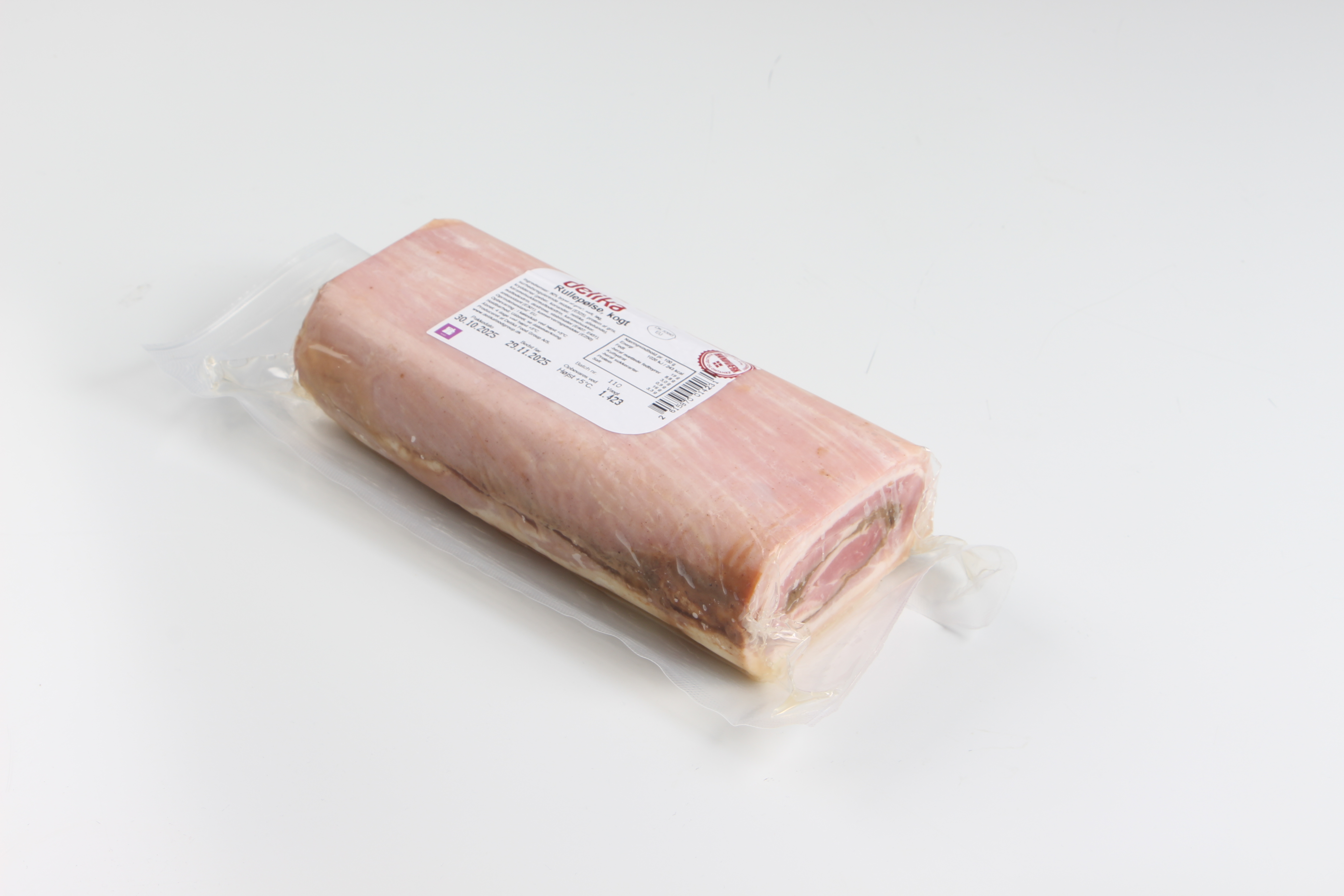 90% svinebryst, løg, salt, surhedsregulerende middel ﴾E325﴿, stabilisatorer ﴾E407, E451﴿, svineprotein, glukose, krydderier ﴾peber, koriander, nelliker, allehånde﴿, karamelsukker, antioxidant ﴾E301﴿, konserveringsmiddel ﴾E250﴿. Kogt