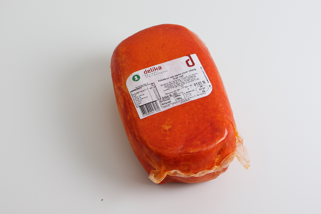 77% kalkunbryst, 20% vand, salt, dextrose, fortykningsmiddler ﴾E407a, E415﴿, maltodextrin, stabilisatorer ﴾E450, E451﴿, antioxidant ﴾E316﴿, surhedsregulerende middel ﴾E500﴿, aroma, krydderier﴾<1%paprika﴿, konserveringsmiddel ﴾E250﴿. Kogt og røget.