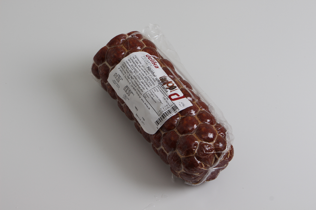 Hammel-spegepølsen. Grise og oksekød, mildt krydret og tilsat sennepskorn. Dekorativ blomsterform. Røget og tørret. Produceret i Danmark. Allergen: Sennep.