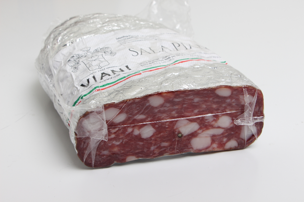 Ingredienser: Svinekød, salt, sukkerarter: dextrose og sukker, krydderier, antioxidant: E301, hvidløg, konserveringsmidler: E252, E250. Glutenfri, lakosefri. Skindet kan ikke spises. 135g svinekød er brugt til 100g af færdigt produkt.