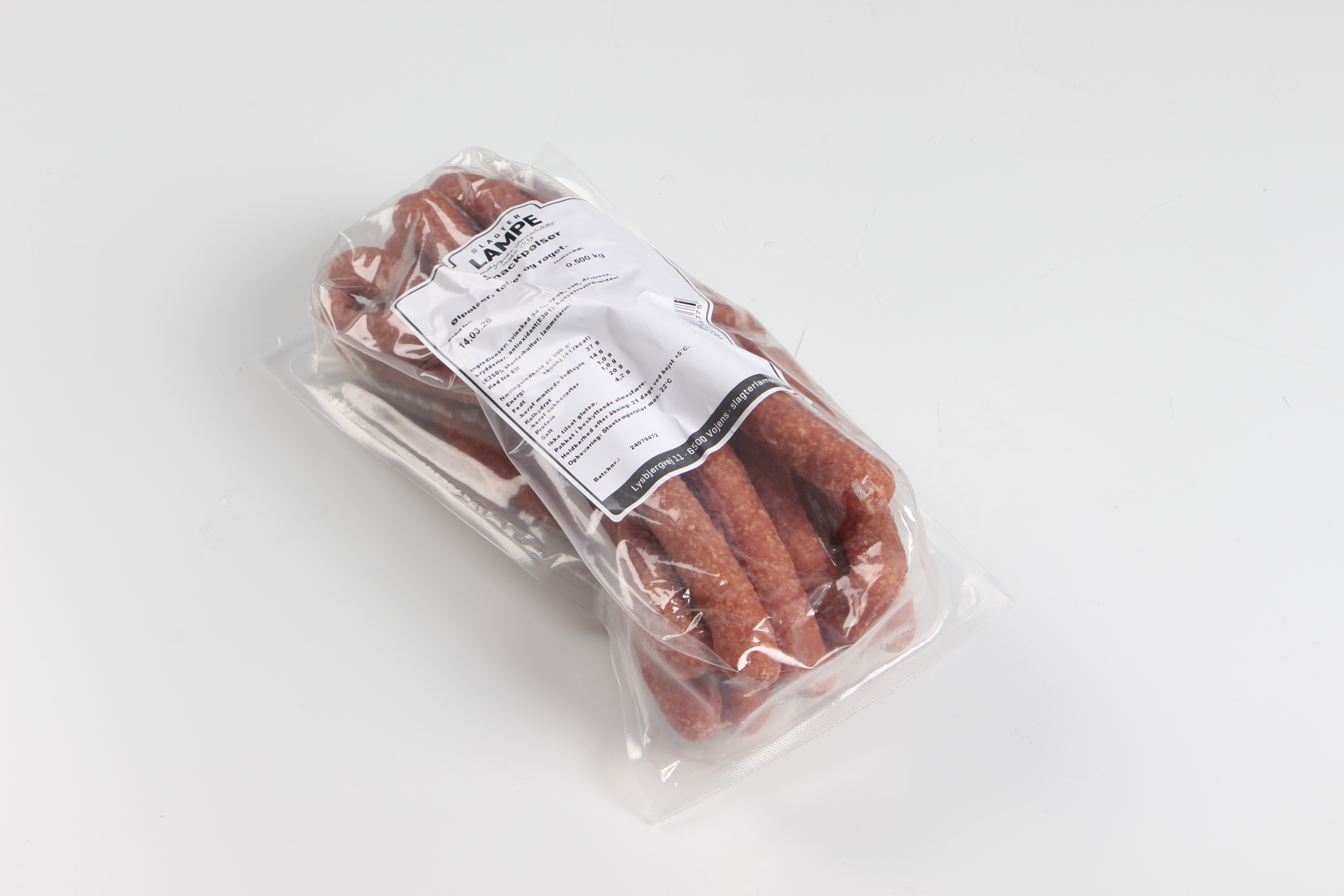 svinekød 94 %, spæk, salt, dextrose, krydderier, antioxidant ﴾E301﴿, konserveringsmiddel ﴾E250﴿, starterkultur, lammetarm