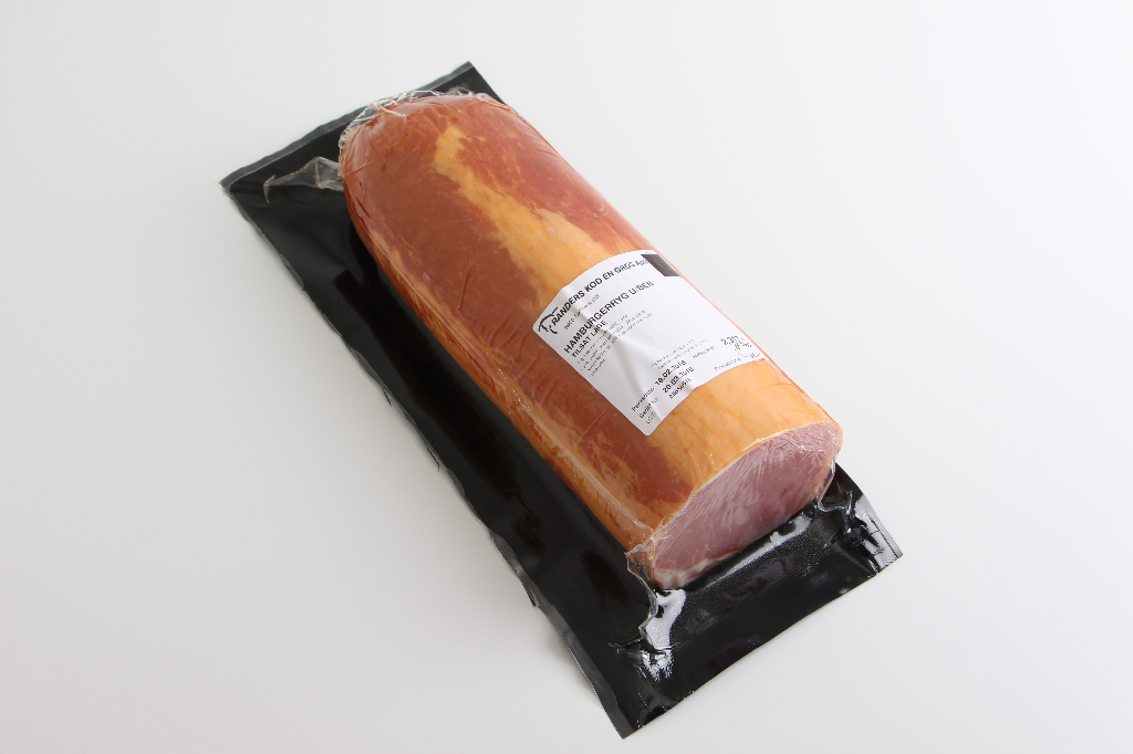 Saltet og røget svinekamfilet i halve, i plasttarm