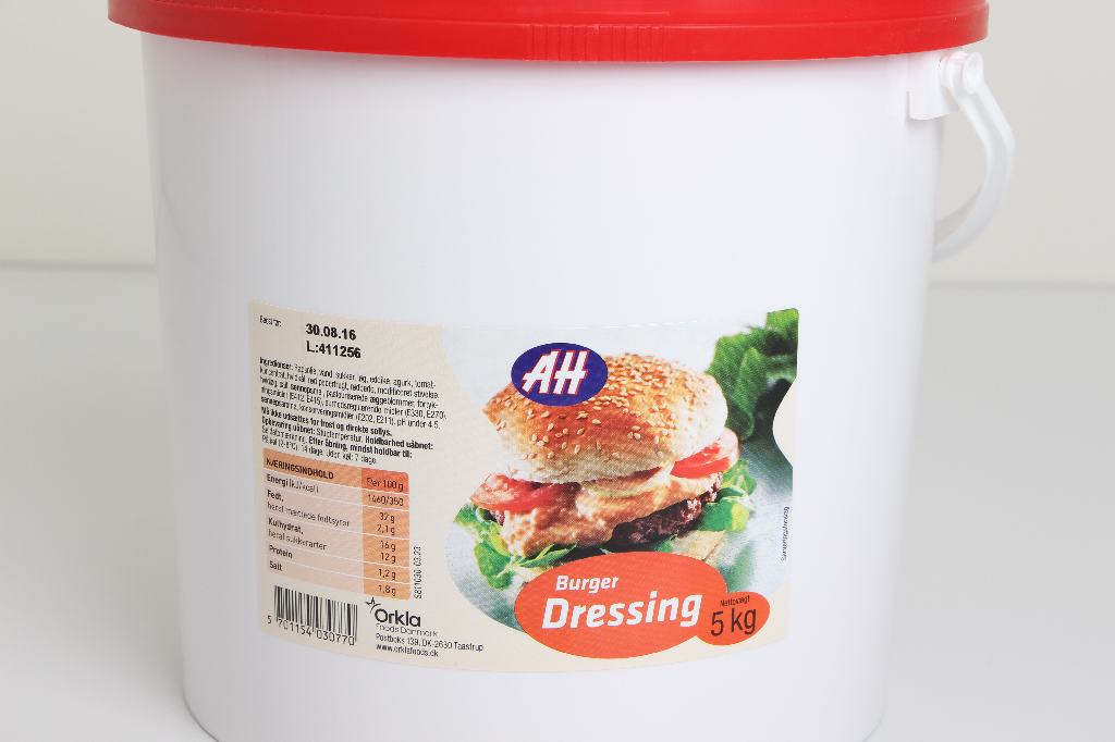 Rapsolie, tomatpuré, vand, sukker, eddike, løg, hvidkål, agurk, rød peberfrugt, rødbede, modificeret stivelse, rødbede,, pasteuriserede ÆGgeblommer, hvidløg, salt, SENNEPsmel, fortykningsmidler (E412, E415), surhedsregulerende midler (E330, E270), konserveringsmidler (E202), antioxidant (E385).