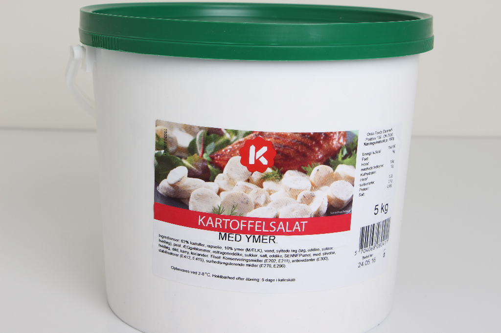 62% Kartofler, rapsolie, 10% YMER (MÆLK), vand, syltede løg (løg, eddike, sukker, hvidløg), estragoneddike (eddike, estragonekstrakt), past. ÆGGEBLOMMER, sukker, salt, eddike, SENNEPSMEL, modificeret stivelse, hvidløgspulver, dild, krydderier. Tilsat: konserveringsmidler (E202, E211), stabilisatorer (E412, E415), surhedsregulerende midler (E270, E296).