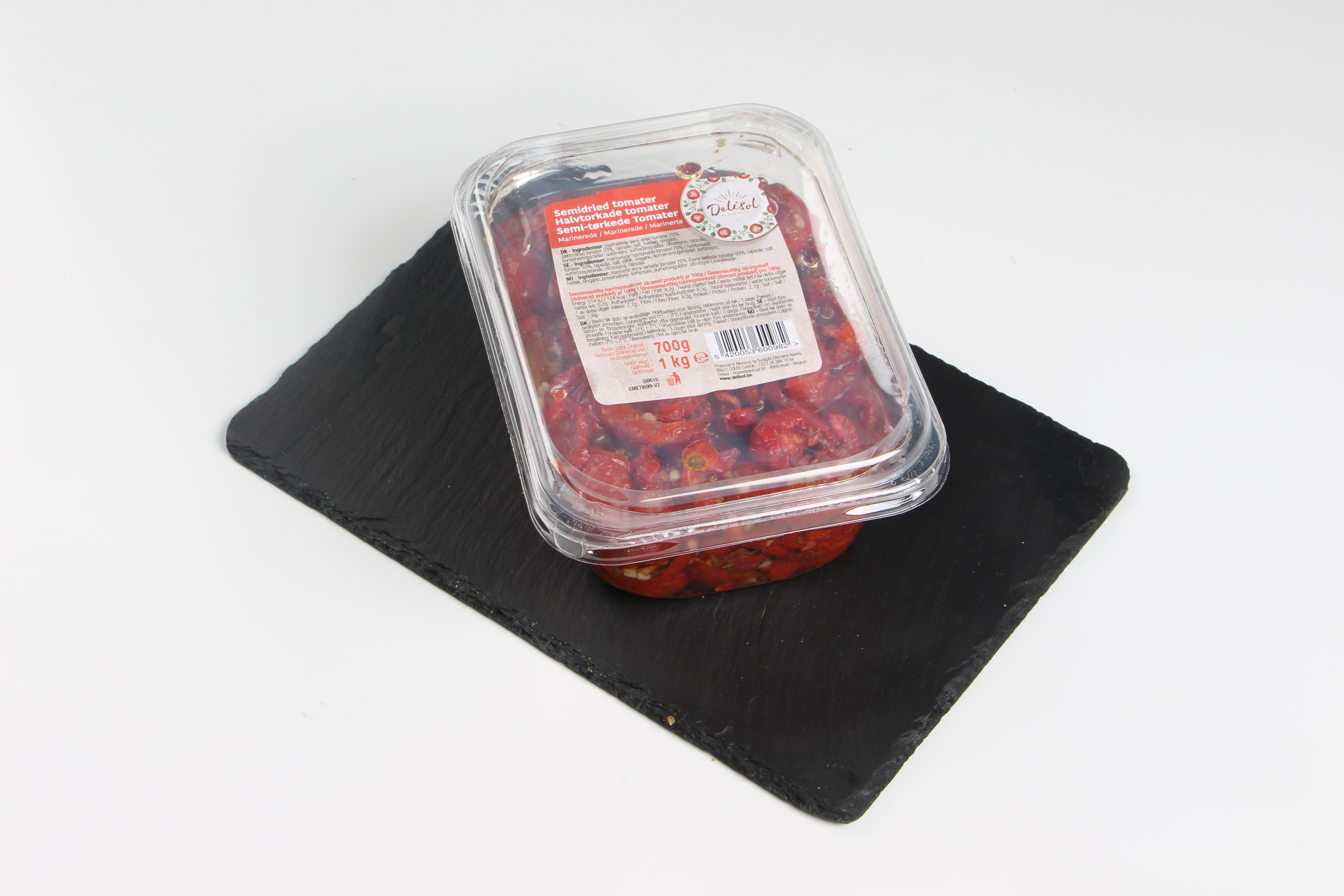 Halvtørrede tomater (93%), rapsolie, salt, hvidløg, oregano, konserveringsmiddel (sorbinsyre) surhedsregulerende middel (citronsyre)), rapsolie. Anvendelse: Hæld olien fra og produktet er klar til brug. Marinaden kan stadig bruges til andre formål.