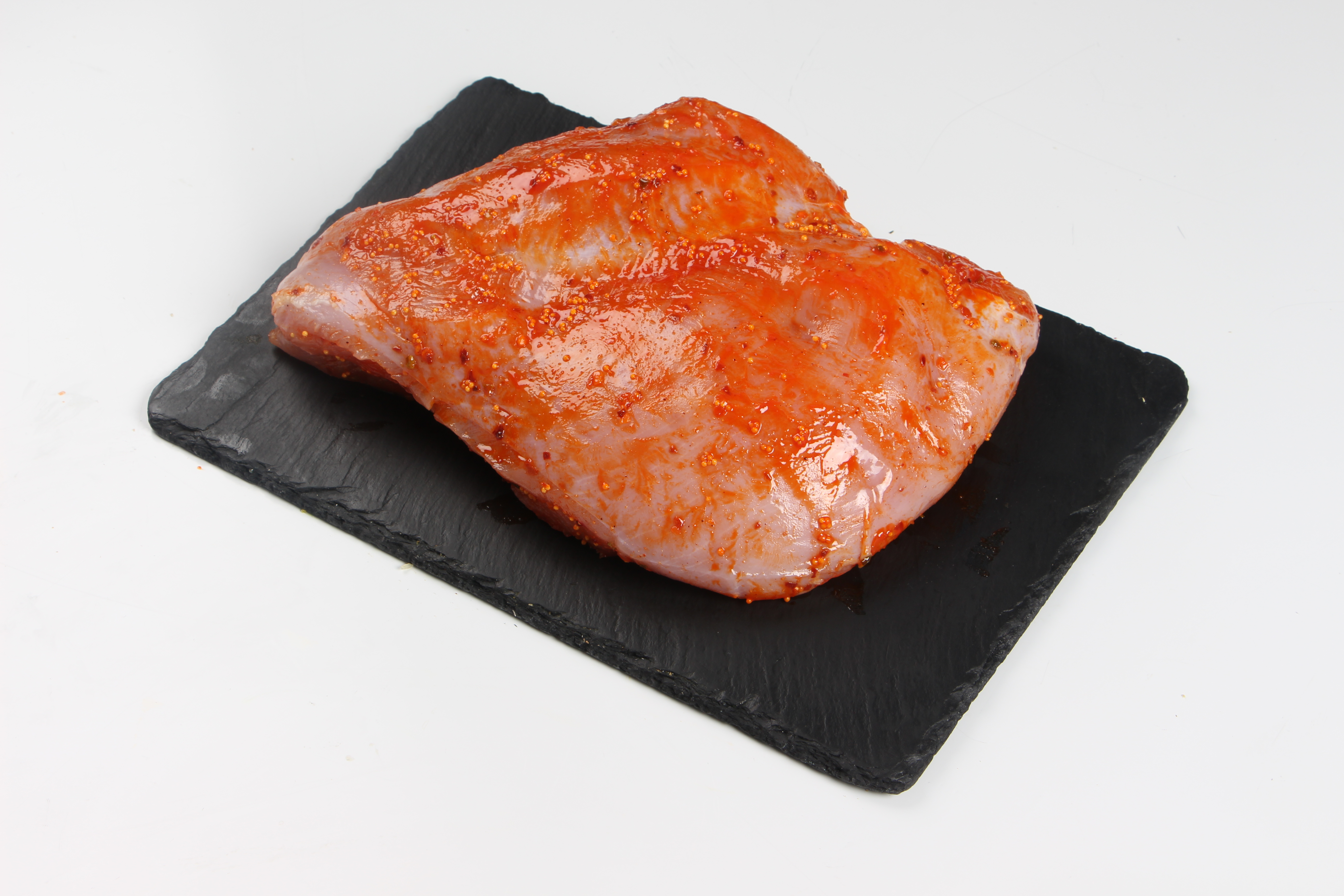 Kalkunbryst, vand, salt, nitritsalt (E250), tilsat marinade: (Vegetabilsk olie (raps, delvis hærdet), krydderier (SENNEP, chili, koriander, hvidløg, muskatnød, løg), salt, dextrose, krydderiekstrakt (paprika)).
